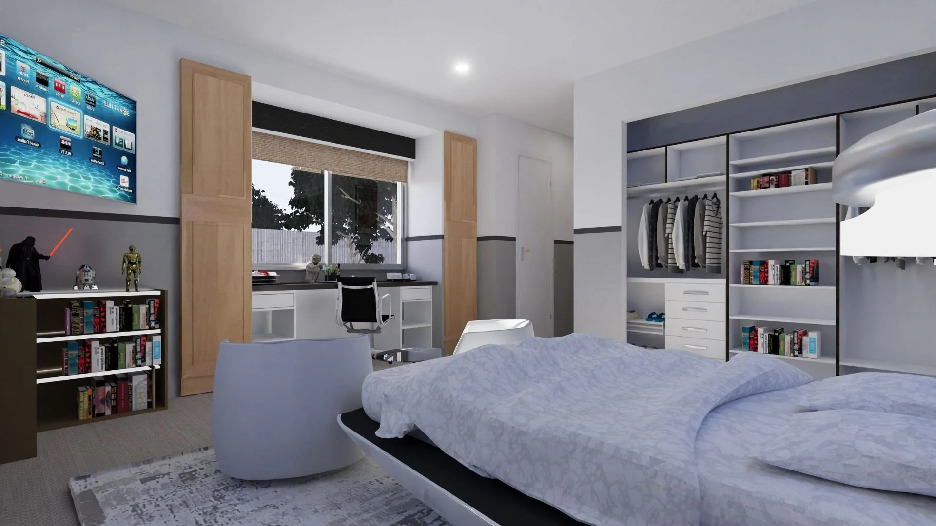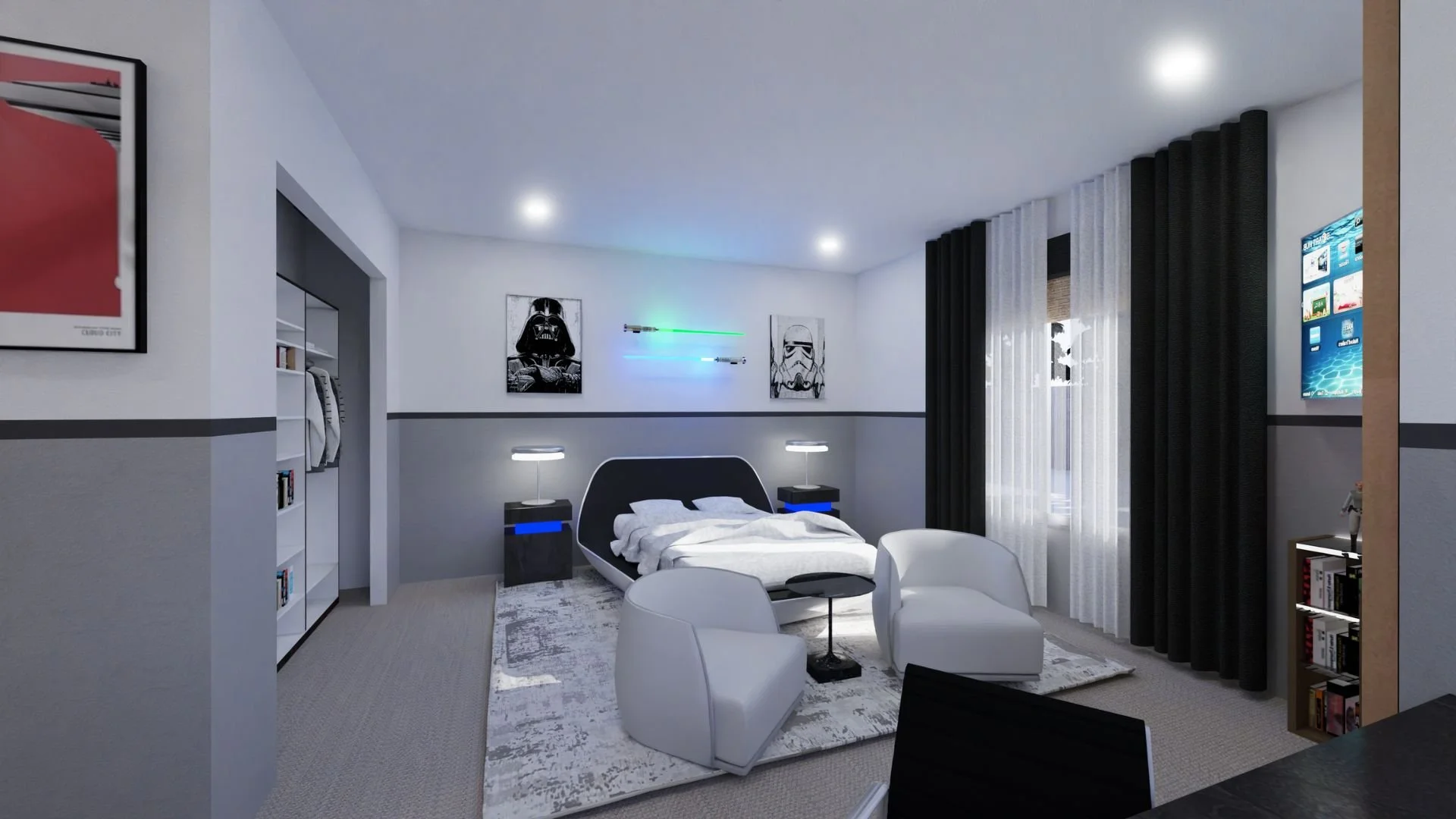 We kept the larger furniture pieces clean and neutral but gave them futuristic shapes for a subtle nod to the Star Wars universe. The custom nightstands feature integrated LED lighting that changes color—just like the lightsabers mounted on the wall. In one corner, we designed a custom L-shaped bookcase to showcase his extensive collection of figures and models. A black-and-white window treatment, sleek enough to impress the Empire itself, frames the space with drama.
